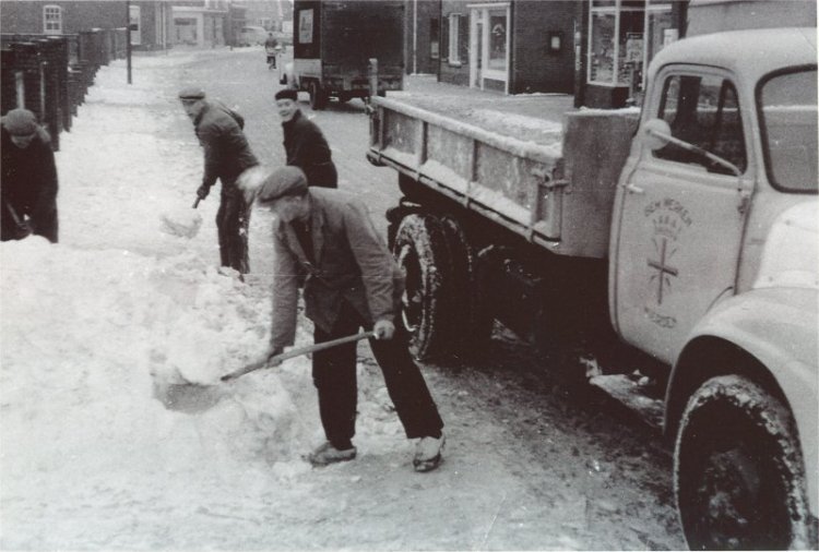 Mannes Nijmeijer Mannes Nijmeijer (Beumers-Mans). G. Hemel. G. Geels (Get van ’n Breader). Gerrit ten Brinke. tijdens het sneeuwruimen in…