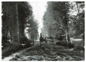 De Kattelaarsdijk begin jaren dertig van de vorige eeuw. Nog niet verhard, maar de elektriciteit is net aangelegd. De man op de wagen is Jan ten Kartelaar. De fot is genomen bij de brug over de Entergraven.
